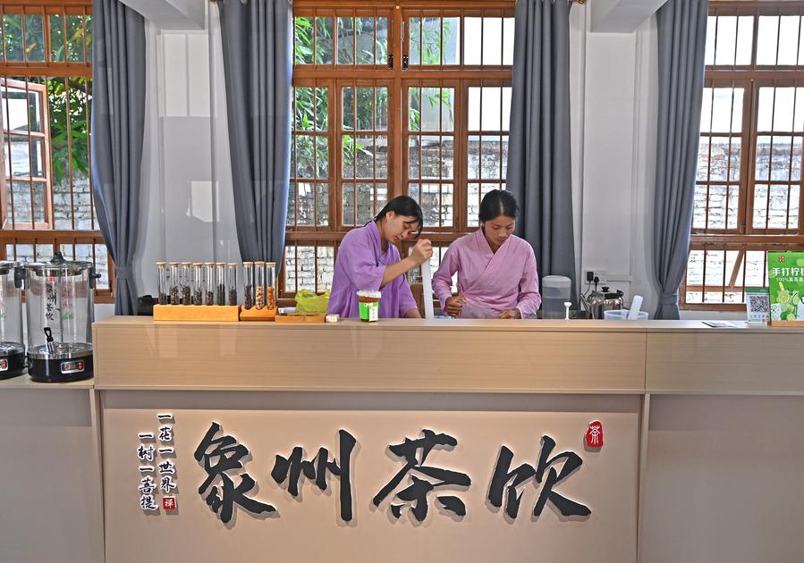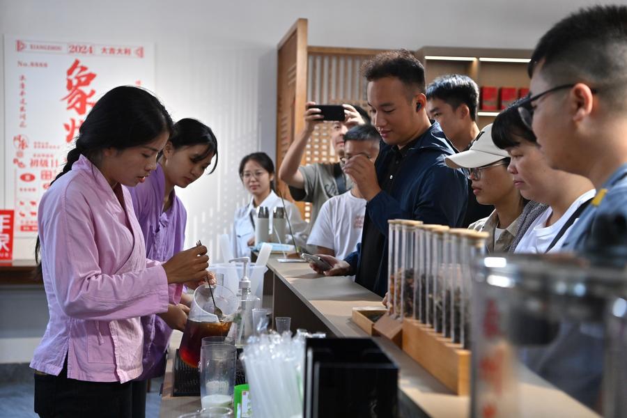 Feng Kangchong (1st L) makes tea drinks for customers in Sigao Village, Miaohuang Township of Xiangzhou County, Laibin City of south China's Guangxi Zhuang Autonomous Region, Oct. 10, 2024. (Xinhua/Zhou Hua)