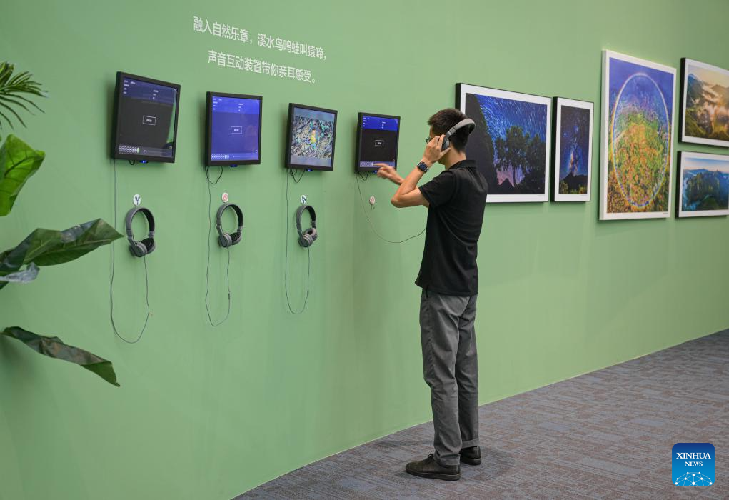 A man listens to the sound from nature at the "Guarding Rainforest Homeland" exhibition in Haikou, south China's Hainan Province, Oct. 13, 2024. The "Guarding Rainforest Homeland" exhibition has been held by the management office of the National Park of Hainan Tropical Rainforest in Haikou. Featuring animal specimens, photographs and videos, the exhibition showcases the beauty of rainforest and introduces the construction process of the National Park of Hainan Tropical Rainforest. (Xinhua/Pu Xiaoxu)
