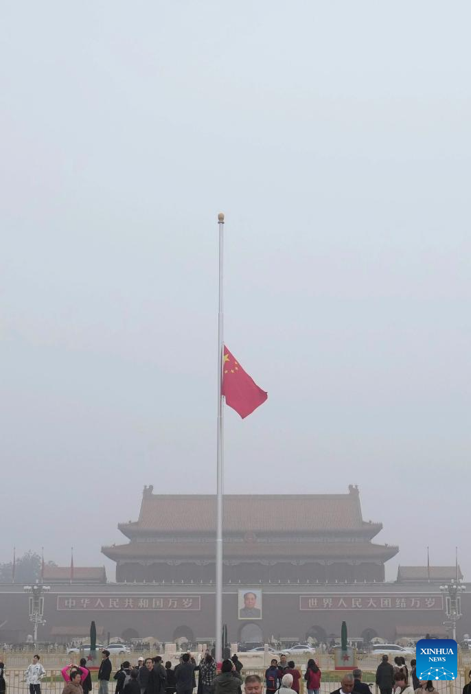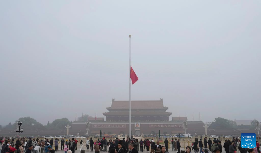 A Chinese national flag flies at half-mast to mourn the death of Comrade Wu Bangguo at Tian'anmen Square in Beijing, capital of China, Oct. 14, 2024. (Xinhua/Ju Huanzong)