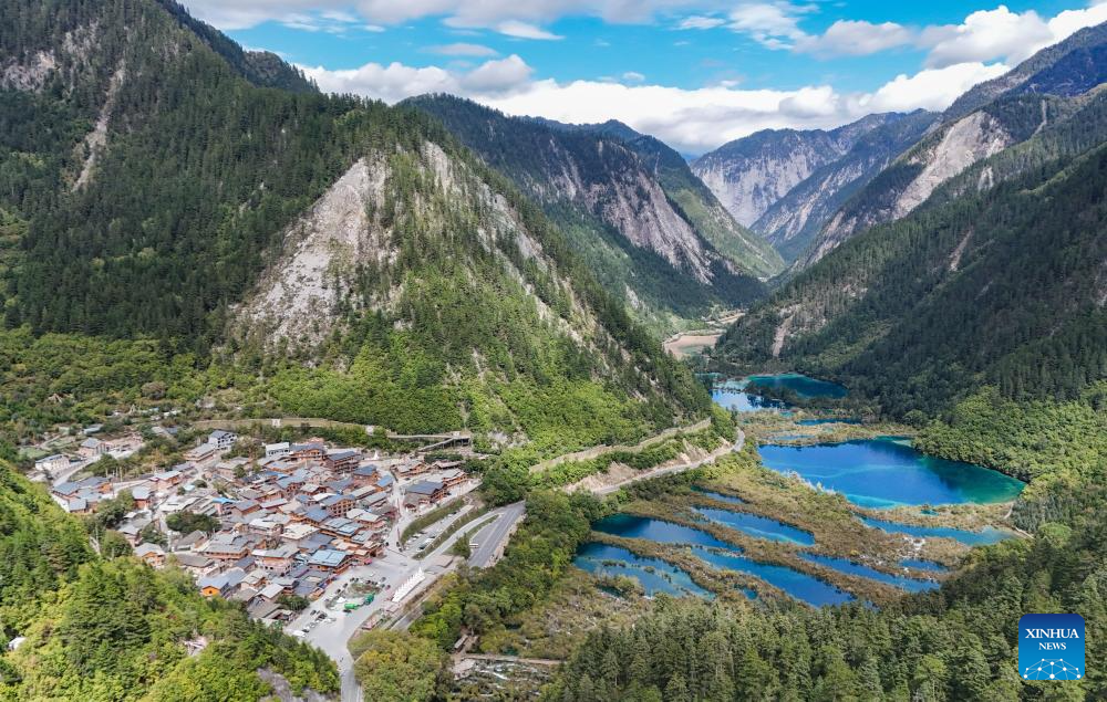 This aerial photo taken on Oct. 10, 2024 shows an autumn view of a village and nearby lakes in Jiuzhaigou scenic spot in southwest China's Sichuan Province. (Xinhua/Wang Xi)