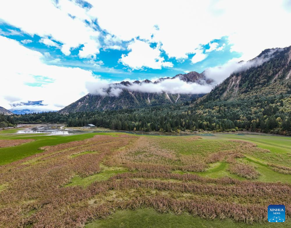 This aerial photo taken on Oct. 12, 2024 shows an autumn view of an alpine wetland in Jiuzhaigou County, southwest China's Sichuan Province. (Xinhua/Wang Xi)