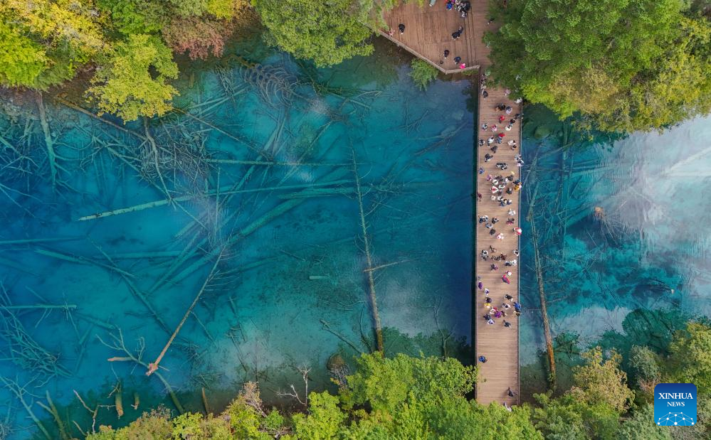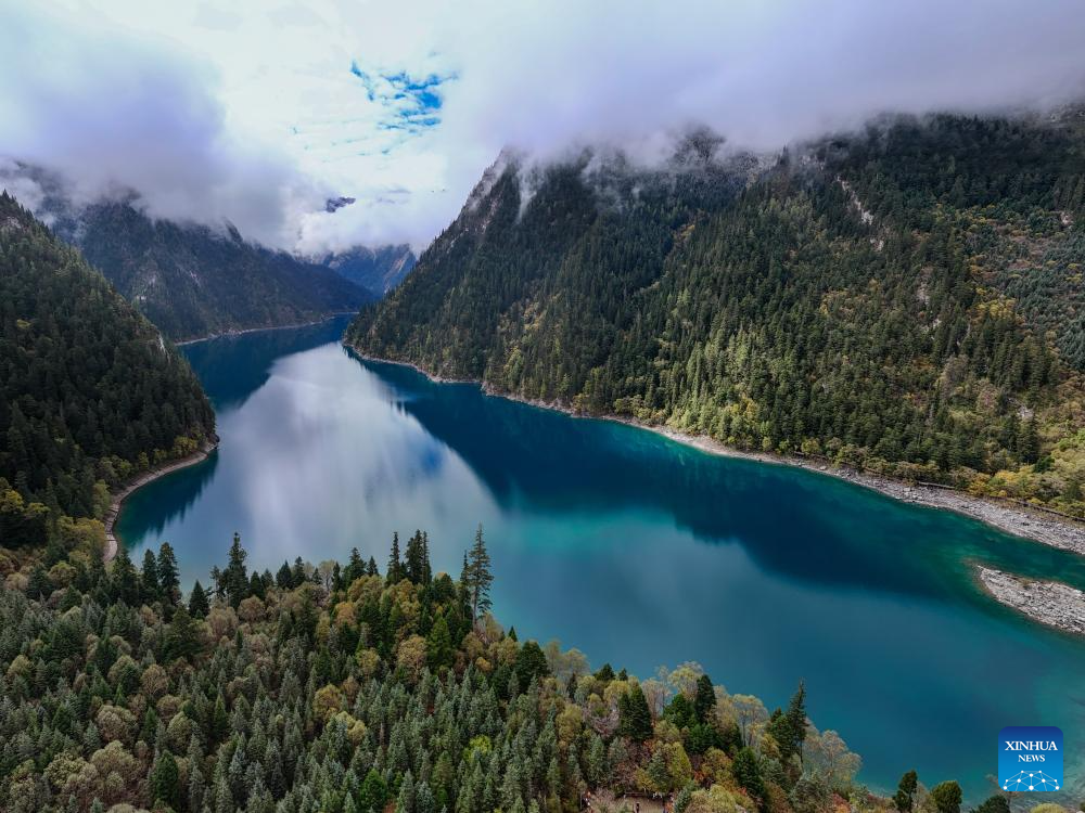 This aerial photo taken on Oct. 10, 2024 shows an autumn view of a lake in Jiuzhaigou scenic spot in southwest China's Sichuan Province. (Xinhua/Wang Xi)