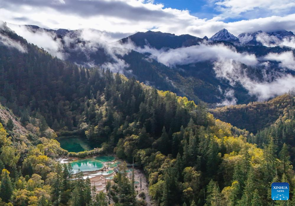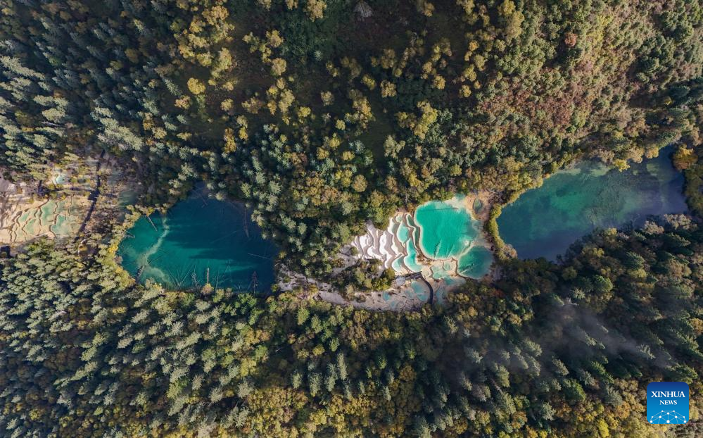 This aerial photo taken on Oct. 12, 2024 shows an autumn view of a plateau lake and calcification ponds in Jiuzhaigou County, southwest China's Sichuan Province. (Xinhua/Wang Xi)