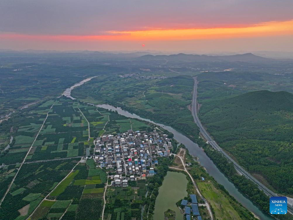 An aerial drone photo shows a view of Nalu Village at sunset in Xiangzhou County, south China's Guangxi Zhuang Autonomous Region, Oct. 9, 2024.