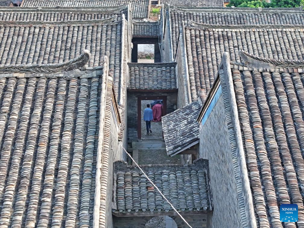 An aerial drone photo shows a tourist dancing at an ancient house at Nalu Village of Xiangzhou County, south China's Guangxi Zhuang Autonomous Region, Oct. 10, 2024.