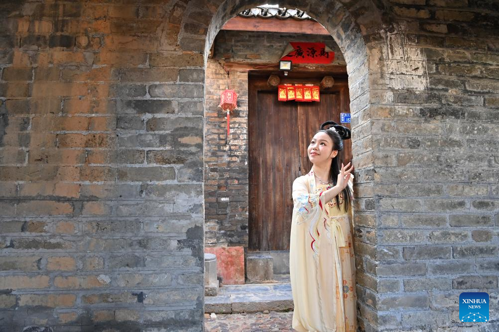 A tourist poses for photos at an alley at Nalu Village of Xiangzhou County, south China's Guangxi Zhuang Autonomous Region, Oct. 10, 2024.