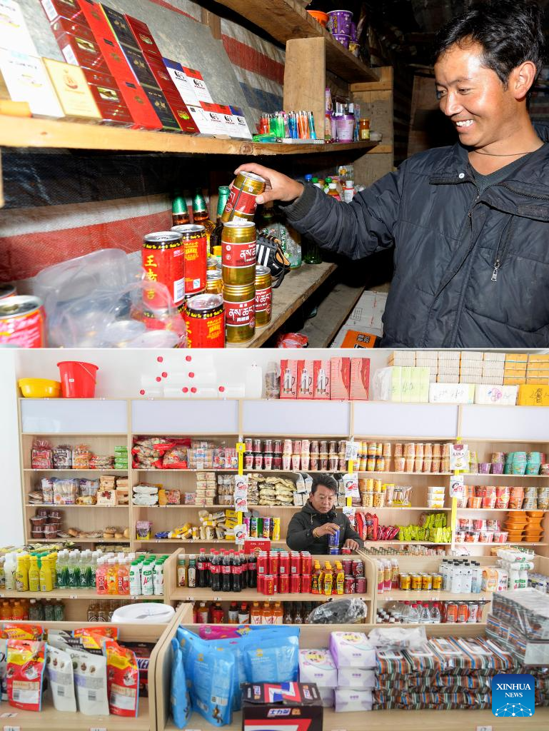 This combo photo shows Cedain Zhaxi, a shop owner, organizing products in Yumai Township of Shannan City, southwest China's Xizang Autonomous Region on Sept. 9, 2009 (above, photo by Xinhua photographer Purbu Zhaxi), and Baima Wangdui, a worker, organizing products at a shop in Yumai Township of Shannan City, southwest China's Xizang Autonomous Region on Oct. 15, 2024 (photo by Xinhua photographer Ding Ting). (Xinhua)