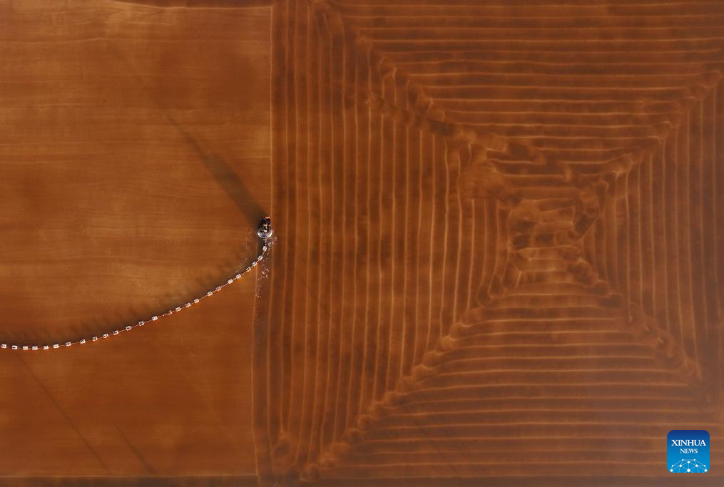 An aerial drone photo taken on Oct. 16, 2024 shows a worker operating a machinery harvesting salt at Nanpu salt field in Caofeidian District of Tangshan, north China's Hebei Province. (Xinhua/Yang Shiyao)
