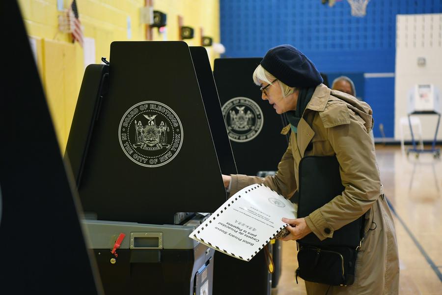A voter casts her ballot at a polling station in New York, the United States, on April 2, 2024. (Xinhua/Li Rui)