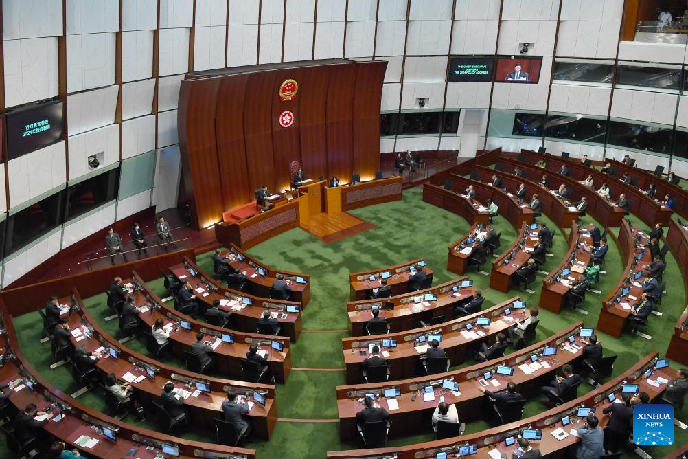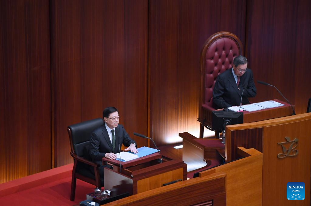 John Lee (L), chief executive of the Hong Kong Special Administrative Region (HKSAR), delivers his third policy address to the HKSAR Legislative Council in Hong Kong, south China, Oct. 16, 2024. (Xinhua/Chen Duo)