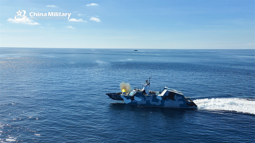 A fast attack missile boat attached to a group with the navy under the Chinese PLA Southern Theater Command fires jamming shells during a recent maritime training exercise. (eng.chinamil.com.cn/Photo by Wan Songtao)