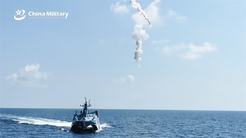 A fast attack missile boat attached to a group with the navy under the Chinese PLA Southern Theater Command fires at mock targets during a recent maritime training exercise. (eng.chinamil.com.cn/Photo by Wan Songtao)