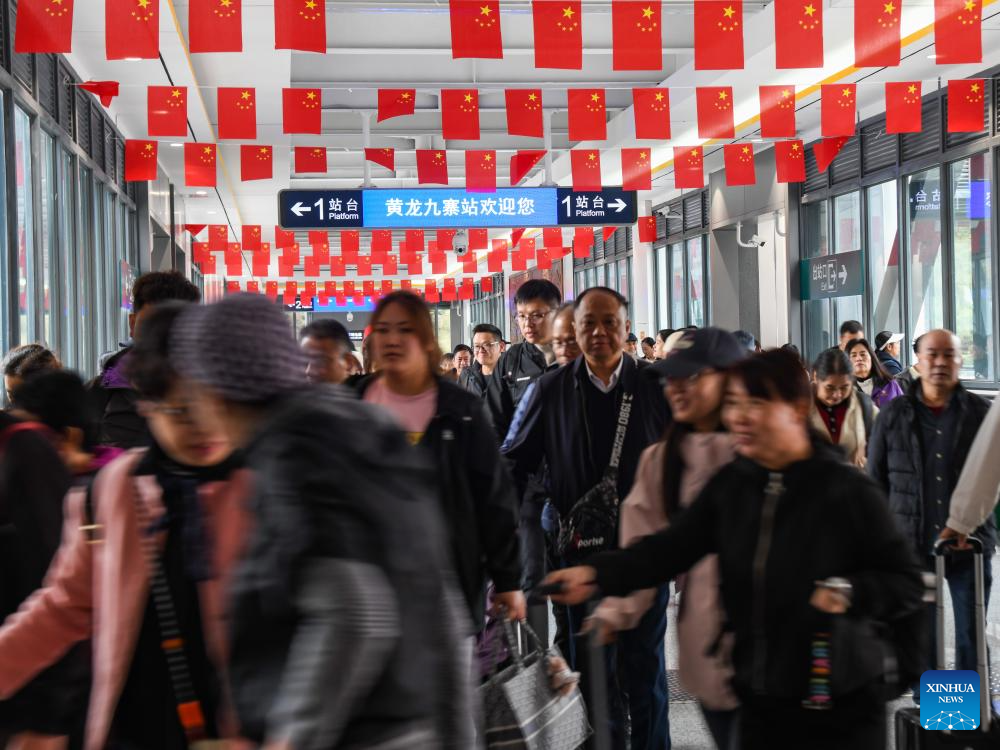 Tourists arrive at Huanglong-Jiuzhai railway station in southwest China's Sichuan Province, Oct. 9, 2024. (Xinhua/Wang Xi)