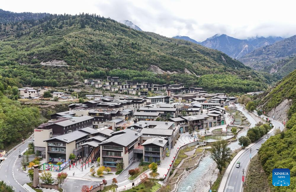 An aerial drone photo taken on Oct. 10 shows a holiday resort in Jiuzhaigou County, southwest China's Sichuan Province. (Xinhua/Wang Xi)