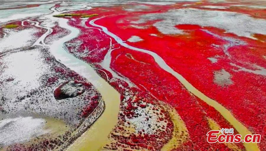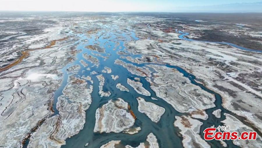 Aerial photo shows migratory birds resting in the wetlands of Lake Gascule in Mangya city, northwest China's Qinghai Province. (Photo: China News Service/Wang Xiaojiong)