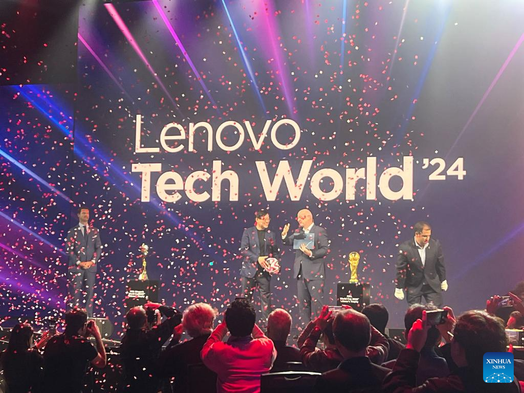This photo taken on Oct. 15, 2024 shows a view of the annual tech summit of Lenovo titled "Lenovo Tech World 24" in Seattle, the United States. FIFA, the world football governing body, announced Lenovo has been named the Official FIFA Technology Partner on the summit. Lenovo launched its annual tech summit in Seattle, the U.S. state of Washington, on Tuesday, featuring the latest innovations and solutions in artificial intelligence (AI). (Xinhua/Tan Jingjing)