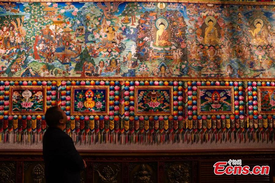 A visitor enjoys a thangka painting at the Renjun Painting Academy in Tongren, Huangnan Tibetan Autonomous Prefecture, Oct. 16, 2024. (Photo: China News Service/Xue Di)