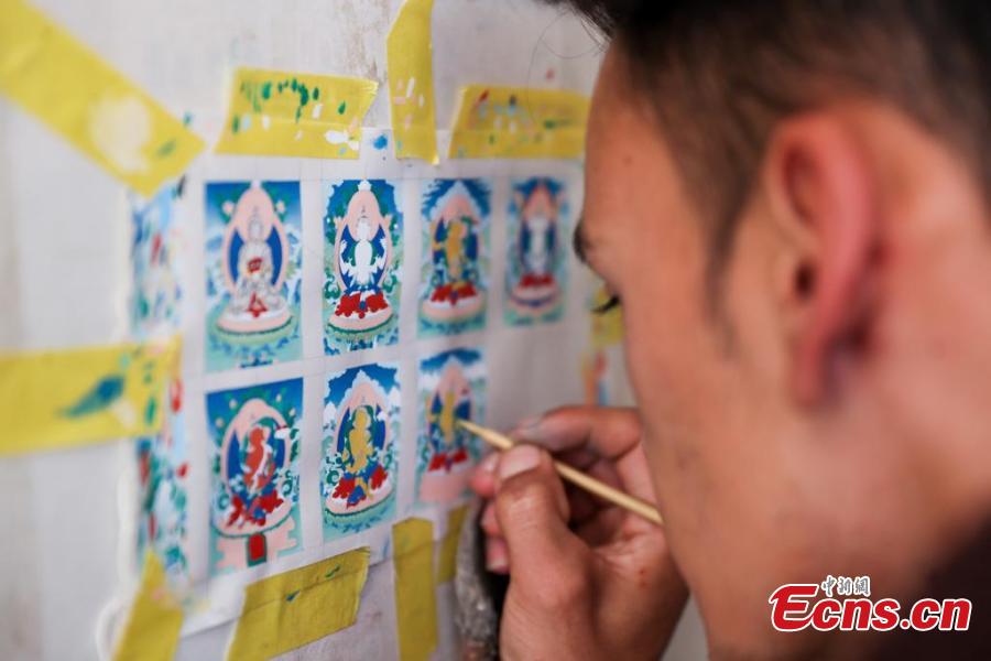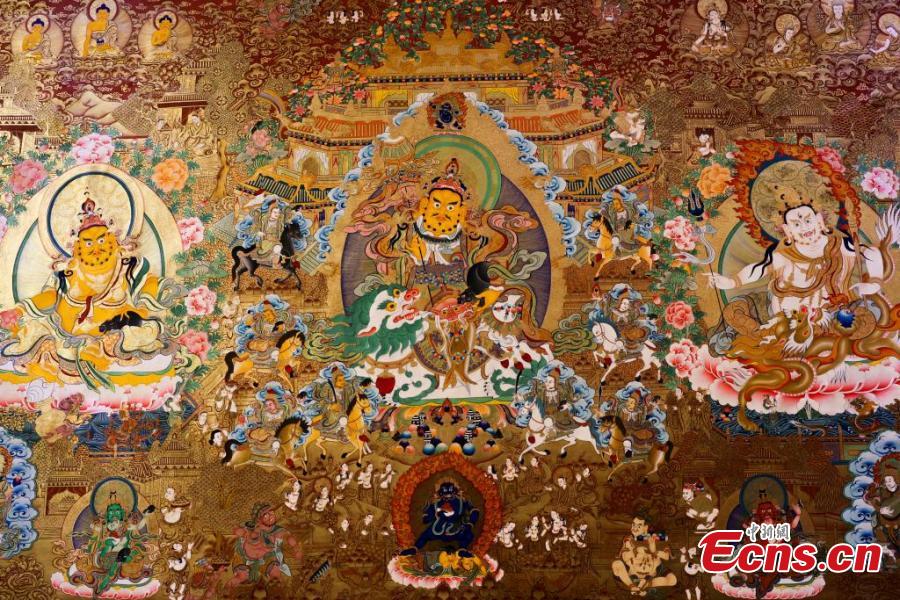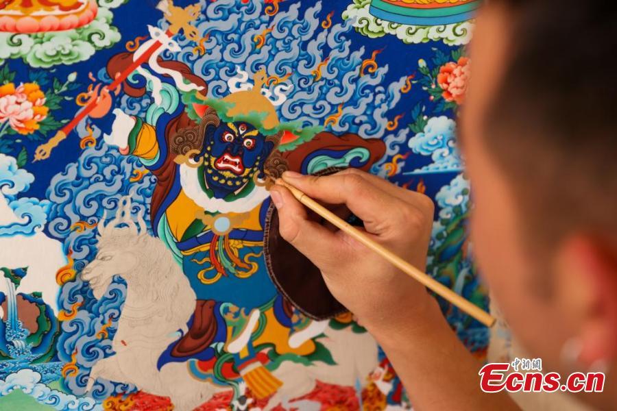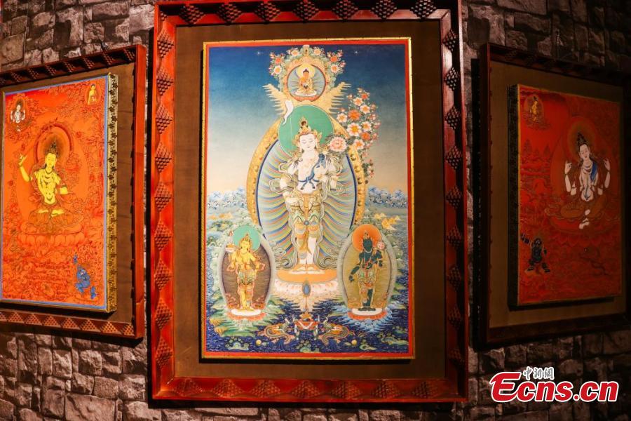 Photo taken on Oct. 16, 2024, shows thangka paintings at the Renjun Painting Academy in Tongren, Huangnan Tibetan Autonomous Prefecture. (Photo: China News Service/Xue Di)