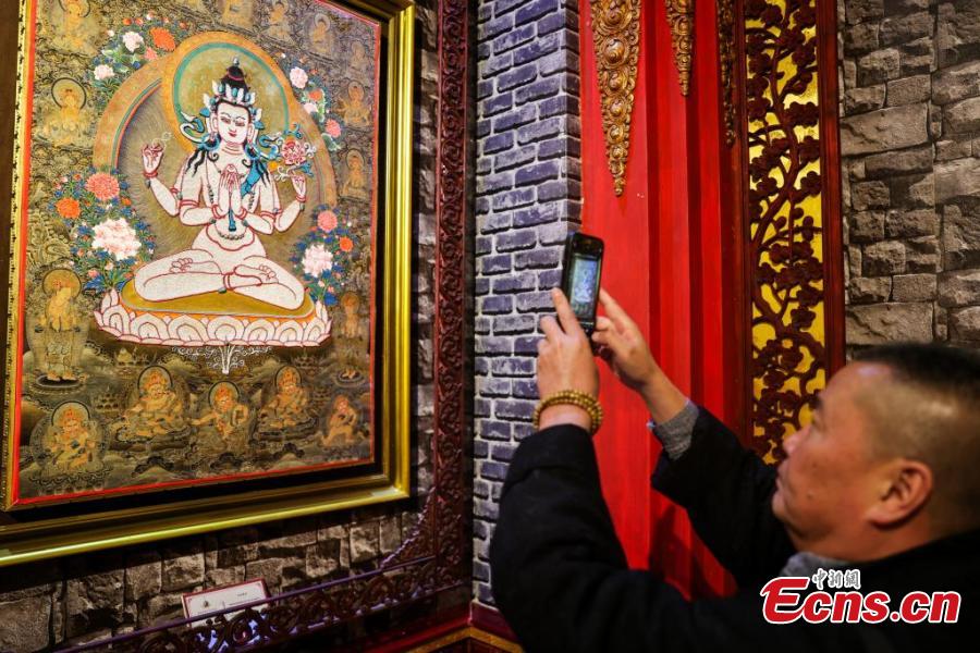 A visitor takes photos of a thangka painting at the Renjun Painting Academy in Tongren, Huangnan Tibetan Autonomous Prefecture, Oct. 16, 2024. (Photo: China News Service/Xue Di)
