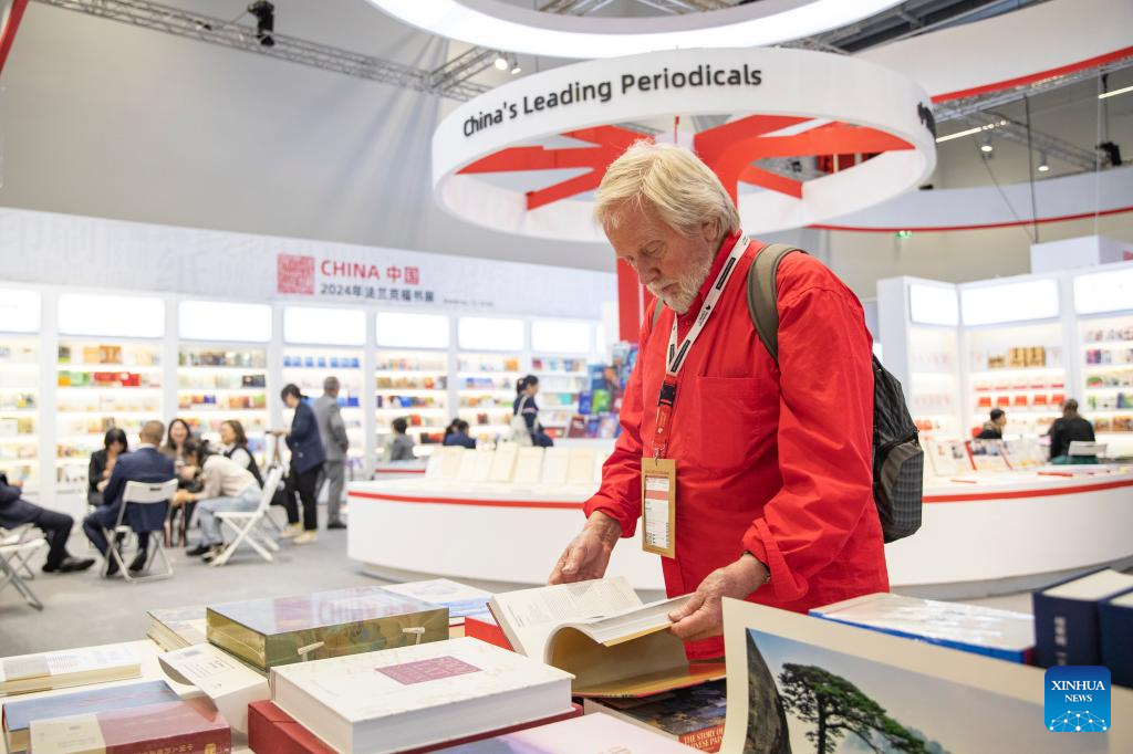 A visitor looks over a book at the Chinese publishers' exhibition area at the 76th Frankfurt Book Fair in Frankfurt, Germany, Oct. 17, 2024. The Frankfurt Book Fair officially opened on Tuesday. Chinese publishers are making a significant impact at this year's fair, showcasing more than 3,500 books, including 1,500 in foreign languages. In addition to new book releases, Chinese publishers are holding numerous premieres and signing ceremonies for copyright agreements, with up to 1,000 books available for copyright trade. The fair will also feature a promotional event for the 2025 Beijing International Book Fair and a session on copyright trade between China and Europe. (Xinhua/Zhang Fan)