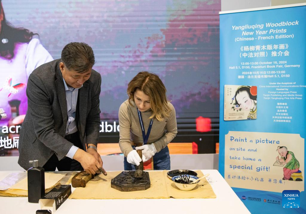 A visitors experiences making skills of woodblock new year prints at the Chinese publishers' exhibition area at the 76th Frankfurt Book Fair in Frankfurt, Germany, Oct. 16, 2024. The Frankfurt Book Fair officially opened on Tuesday. Chinese publishers are making a significant impact at this year's fair, showcasing more than 3,500 books, including 1,500 in foreign languages. In addition to new book releases, Chinese publishers are holding numerous premieres and signing ceremonies for copyright agreements, with up to 1,000 books available for copyright trade. The fair will also feature a promotional event for the 2025 Beijing International Book Fair and a session on copyright trade between China and Europe. (Xinhua/Zhang Fan)