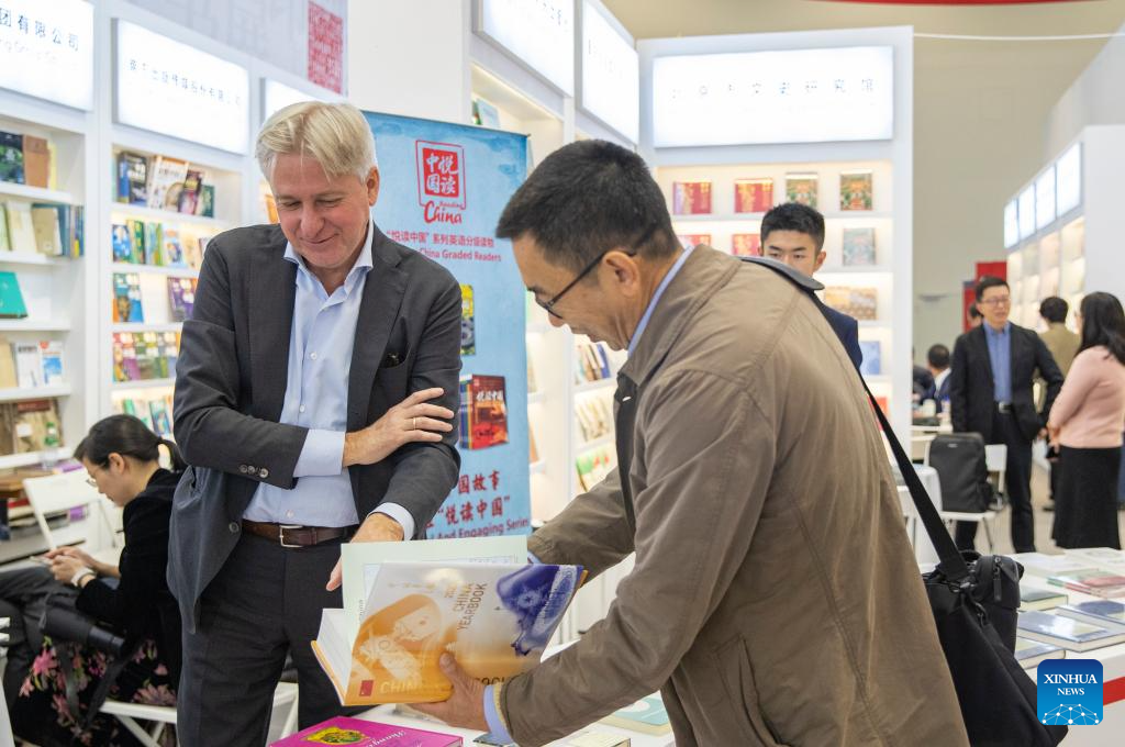 Director of the Frankfurt Book Fair Juergen Boos (L) visits the Chinese publishers' exhibition area at the 76th Frankfurt Book Fair in Frankfurt, Germany, Oct. 16, 2024. The Frankfurt Book Fair officially opened on Tuesday. Chinese publishers are making a significant impact at this year's fair, showcasing more than 3,500 books, including 1,500 in foreign languages. In addition to new book releases, Chinese publishers are holding numerous premieres and signing ceremonies for copyright agreements, with up to 1,000 books available for copyright trade. The fair will also feature a promotional event for the 2025 Beijing International Book Fair and a session on copyright trade between China and Europe. (Xinhua/Zhang Fan)