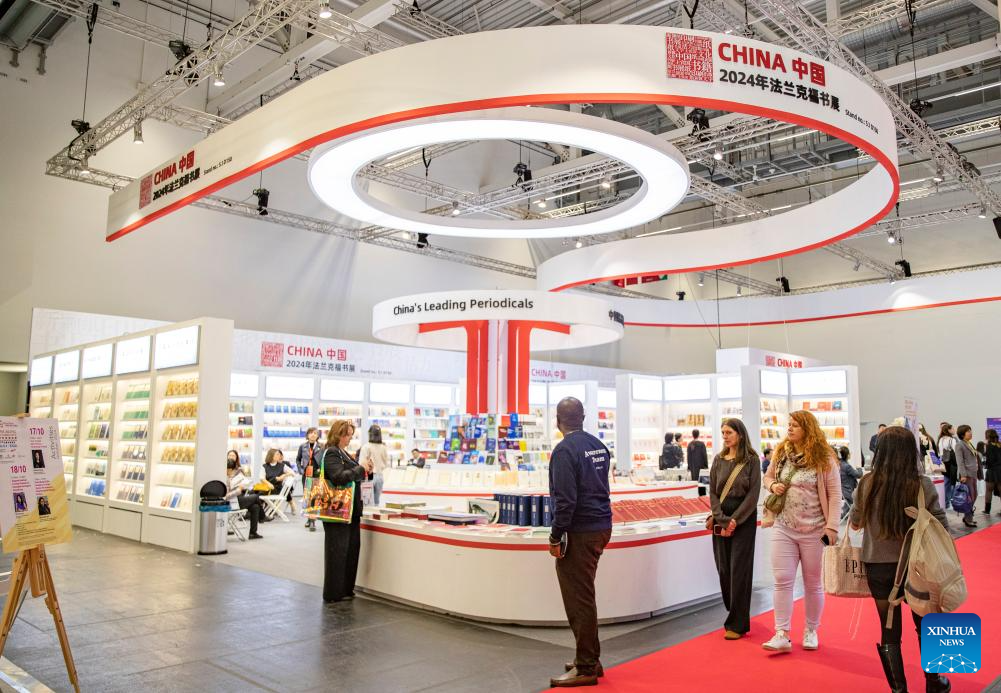 Visitors are pictured at the Chinese publishers' exhibition area at the 76th Frankfurt Book Fair in Frankfurt, Germany, Oct. 17, 2024. The Frankfurt Book Fair officially opened on Tuesday. Chinese publishers are making a significant impact at this year's fair, showcasing more than 3,500 books, including 1,500 in foreign languages. In addition to new book releases, Chinese publishers are holding numerous premieres and signing ceremonies for copyright agreements, with up to 1,000 books available for copyright trade. The fair will also feature a promotional event for the 2025 Beijing International Book Fair and a session on copyright trade between China and Europe. (Xinhua/Zhang Fan)