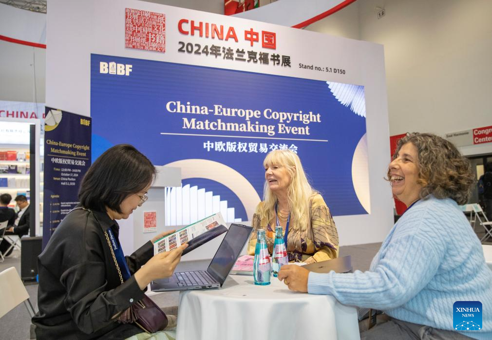 Visitors talk with an exhibitor during the China-Europe Copyright Matchmaking Event at the Chinese publishers' exhibition area at the 76th Frankfurt Book Fair in Frankfurt, Germany, Oct. 17, 2024. The Frankfurt Book Fair officially opened on Tuesday. Chinese publishers are making a significant impact at this year's fair, showcasing more than 3,500 books, including 1,500 in foreign languages. In addition to new book releases, Chinese publishers are holding numerous premieres and signing ceremonies for copyright agreements, with up to 1,000 books available for copyright trade. The fair will also feature a promotional event for the 2025 Beijing International Book Fair and a session on copyright trade between China and Europe. (Xinhua/Zhang Fan)