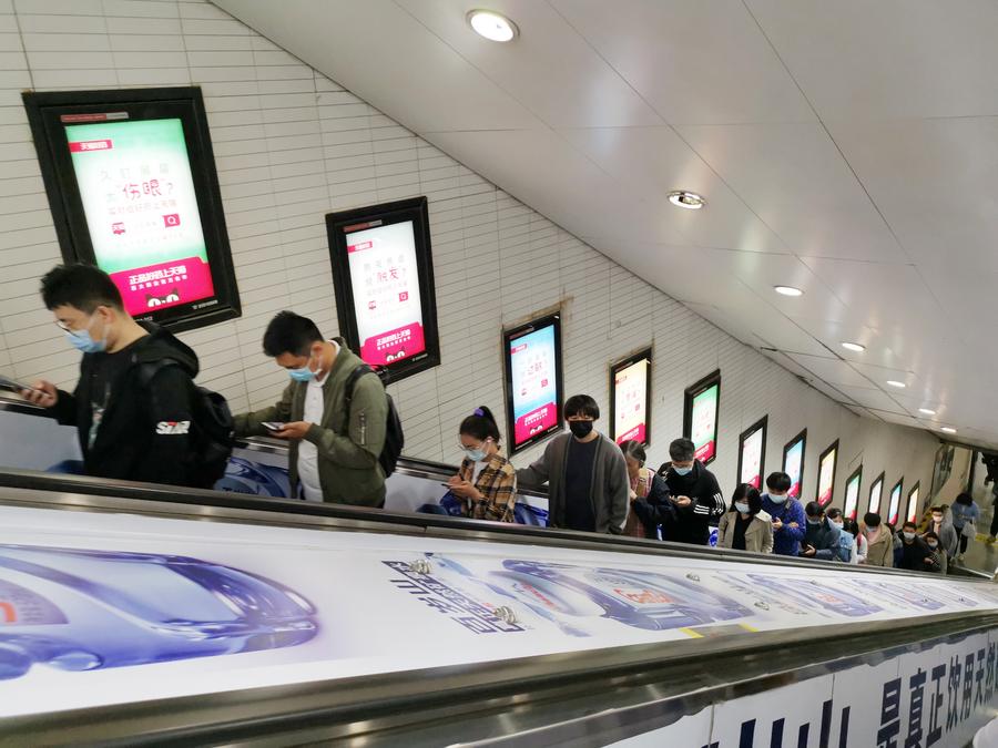 Photo taken with a mobile phone shows people taking an escalator at a subway station in Beijing, capital of China, May 11, 2021. (Xinhua/Ju Huanzong)