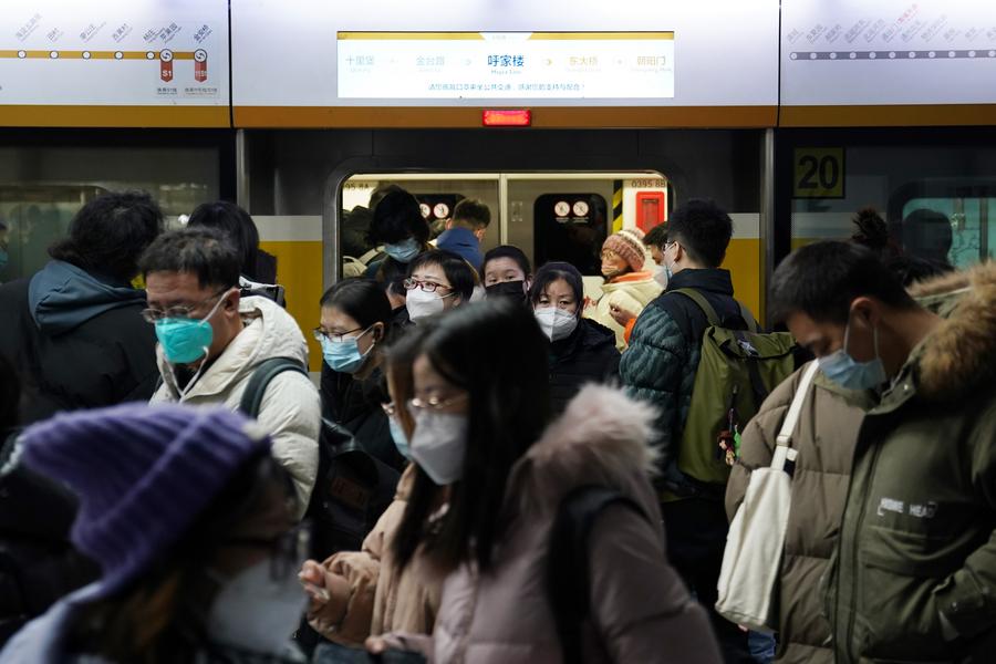 Passengers are seen at Hujialou Subway Station during morning peak hours in Beijing, capital of China, Jan. 3, 2023. (Xinhua/Ju Huanzong)