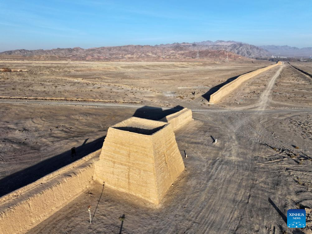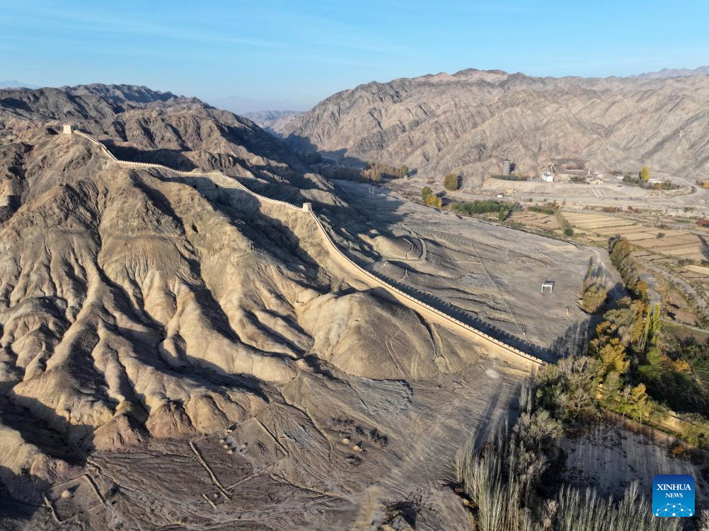 An aerial drone photo taken on Oct. 17, 2024 shows the autumn scenery of a section of the Great Wall near the Jiayu Pass in the city of Jiayuguan, northwest China's Gansu Province. The Jiayu Pass is the starting point of a section of the Great Wall constructed during the Ming Dynasty (1368-1644). The pass also served as a vital passage on the ancient Silk Road. (Xinhua/Chen Yehua)