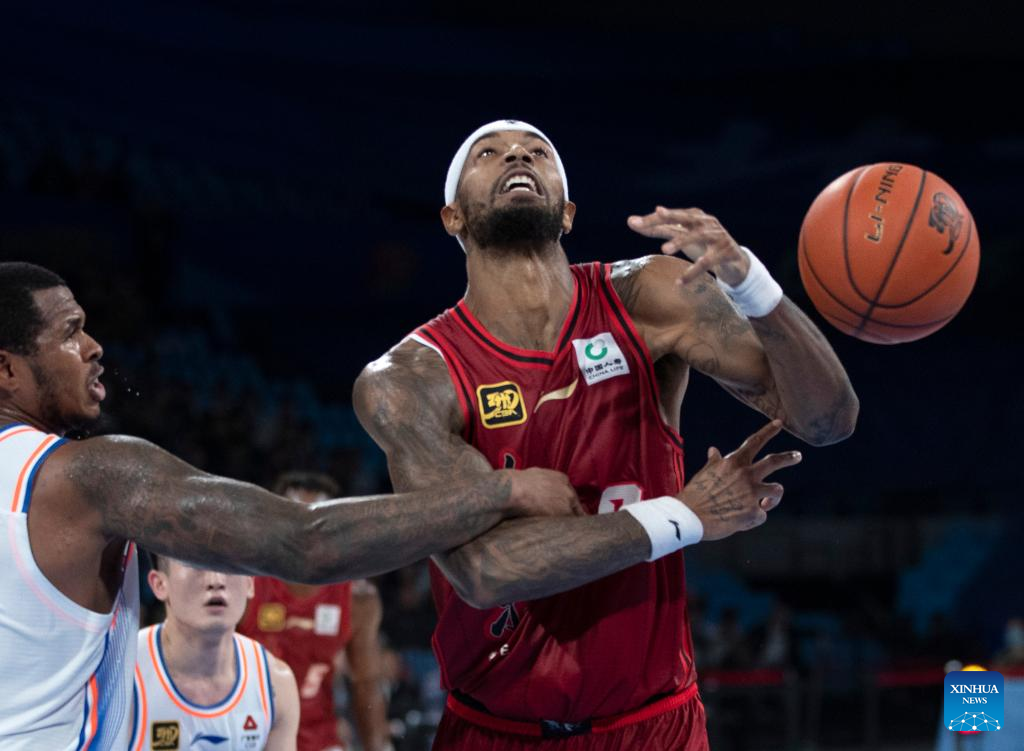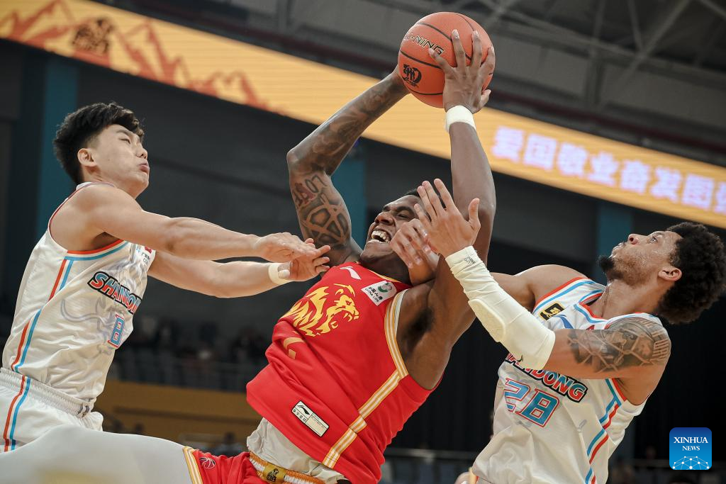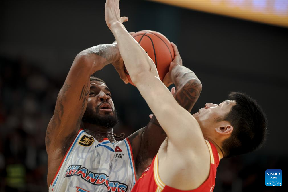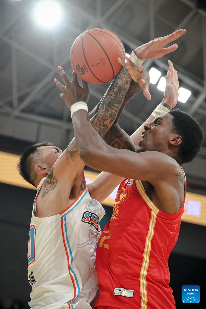 Marquese Chriss (L) of Shandong Heroes goes for a basket during a match between Zhejiang Lions and Shandong Heroes at the 2024-2025 season of the Chinese Basketball Association (CBA) league in Hangzhou, east China's Zhejiang Province, Oct. 17, 2024. (Xinhua/Jiang Han)