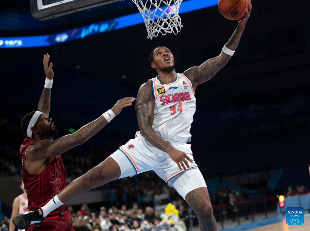 Marcus Georges-Hunt (R) of Sichuan Blue Whales goes to the basket during a match between Beijing Ducks and Sichuan Blue Whales at the 2024-2025 season of the Chinese Basketball Association (CBA) league in Beijing, China, Oct. 17, 2024. (Xinhua/Luo Yuan)