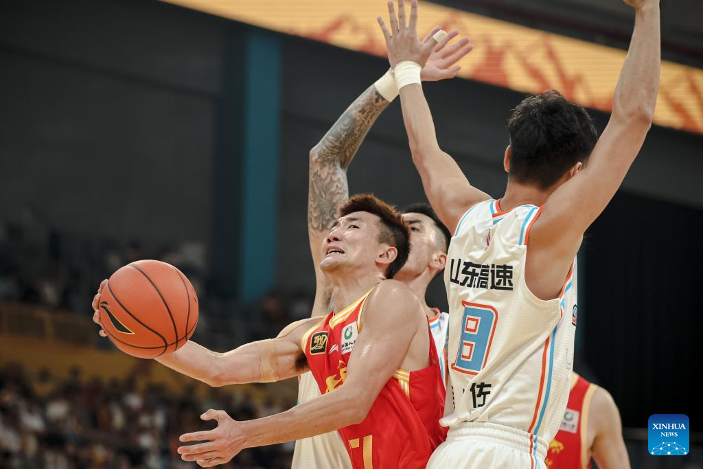 Sun Minghui (L) of Zhejiang Lions goes for a basket during a match between Zhejiang Lions and Shandong Heroes at the 2024-2025 season of the Chinese Basketball Association (CBA) league in Hangzhou, east China's Zhejiang Province, Oct. 17, 2024. (Xinhua/Jiang Han)