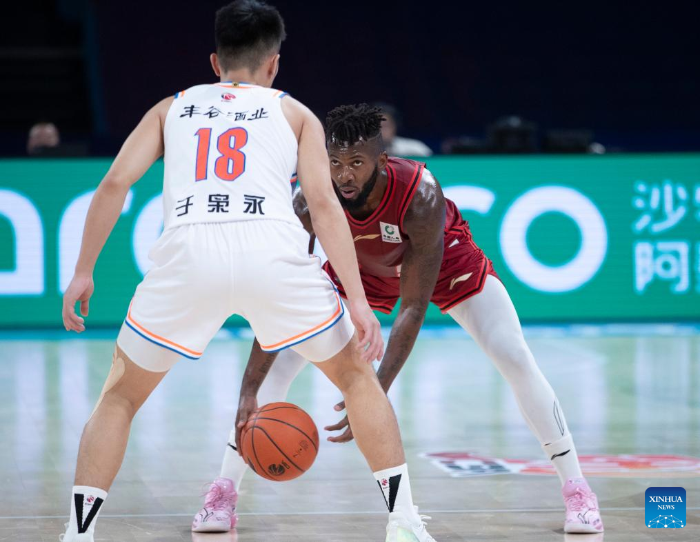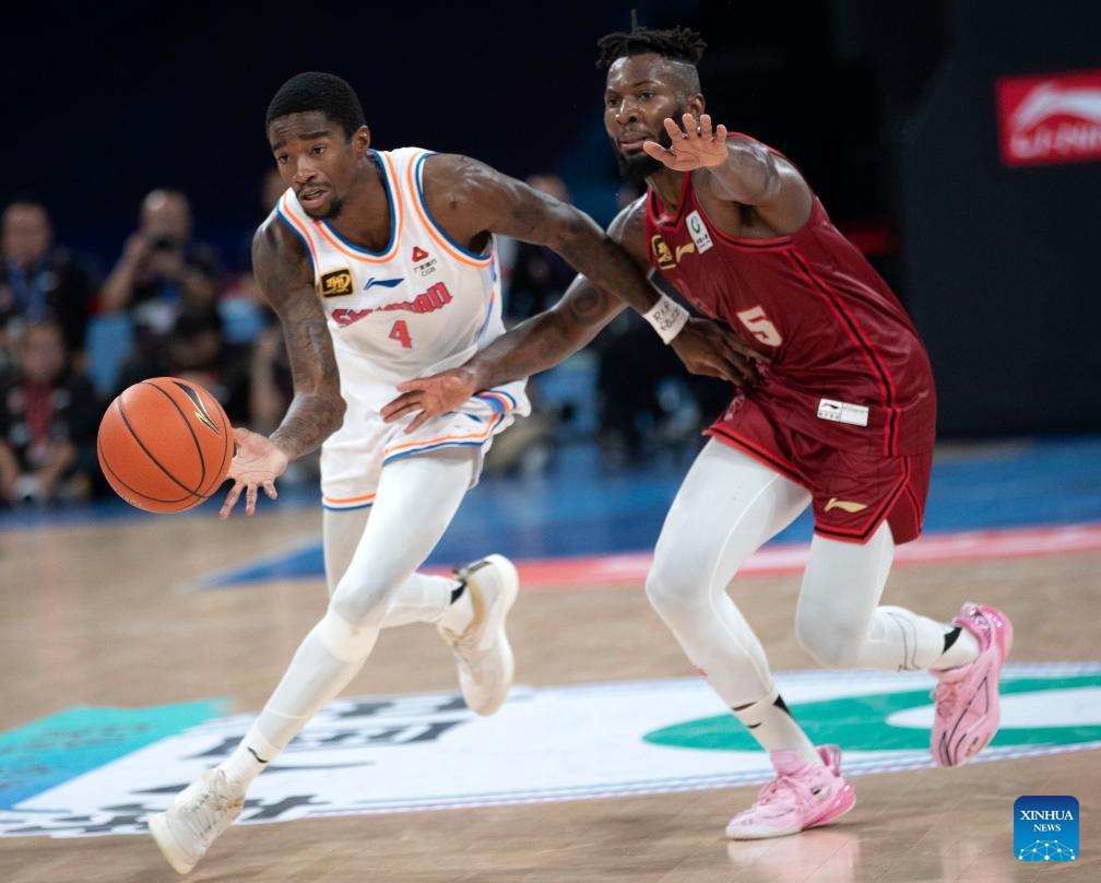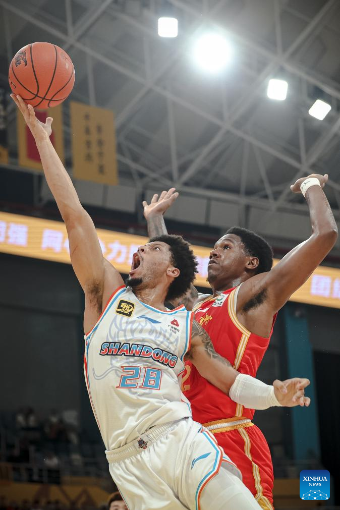 Lindell Wigginton (L) of Shandong Heroes goes for a basket during a match between Zhejiang Lions and Shandong Heroes at the 2024-2025 season of the Chinese Basketball Association (CBA) league in Hangzhou, east China's Zhejiang Province, Oct. 17, 2024. (Xinhua/Jiang Han)