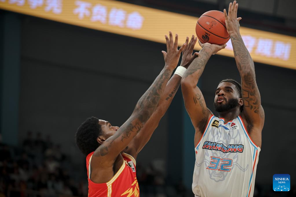 Marquese Chriss (R) of Shandong Heroes shoots during a match between Zhejiang Lions and Shandong Heroes at the 2024-2025 season of the Chinese Basketball Association (CBA) league in Hangzhou, east China's Zhejiang Province, Oct. 17, 2024. (Xinhua/Jiang Han)