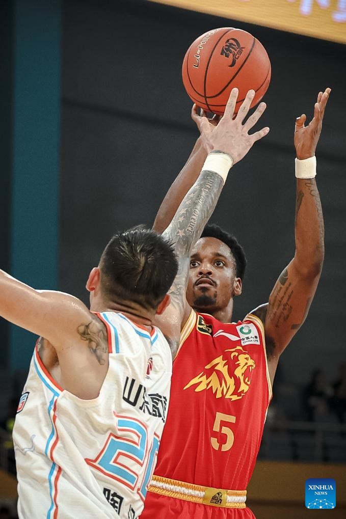 Barry Brown (R) of Zhejiang Lions shoots during a match between Zhejiang Lions and Shandong Heroes at the 2024-2025 season of the Chinese Basketball Association (CBA) league in Hangzhou, east China's Zhejiang Province, Oct. 17, 2024. (Xinhua/Jiang Han)