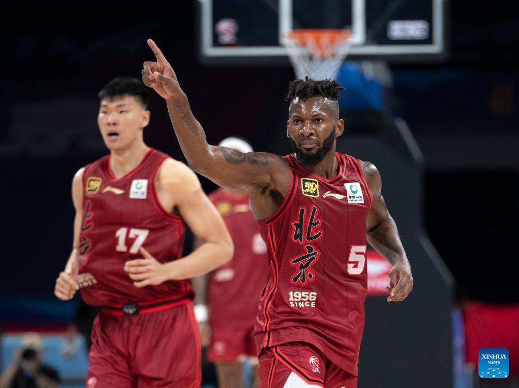 Eugene German (R) of Beijing Ducks celebrates scoring during a match between Beijing Ducks and Sichuan Blue Whales at the 2024-2025 season of the Chinese Basketball Association (CBA) league in Beijing, China, Oct. 17, 2024. (Xinhua/Luo Yuan)