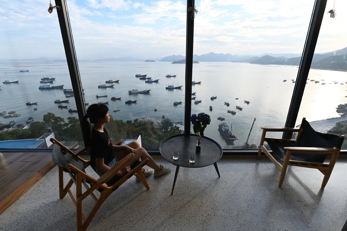 A tourist enjoys sea view at a homestay hotel in Dongbi village, Sansha town, Xiapu county, east China's Fujian Province. (Photo/Xinhua)