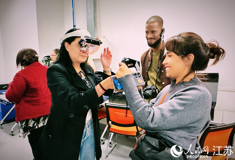 Journalists from Latin American and the Caribbean (LAC) countries try augmented reality (AR) devices at China University of Mining and Technology during their visit to the university under the Belt and Road Youth Friendship Exchange Program launched by People's Daily Online. (People's Daily Online/Zhou Mengjiao)