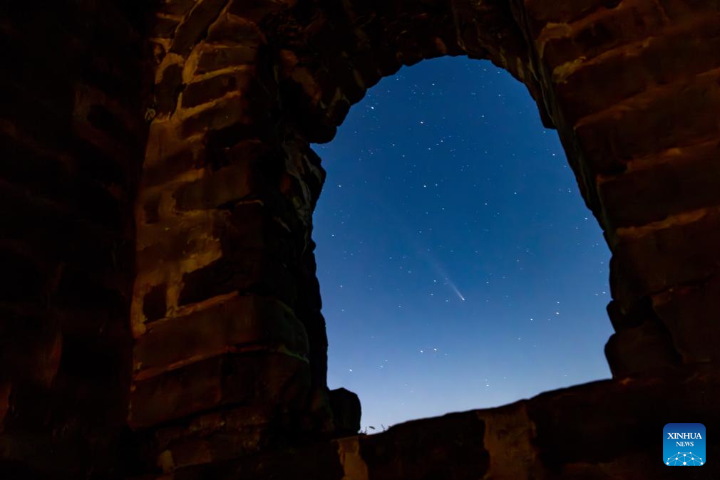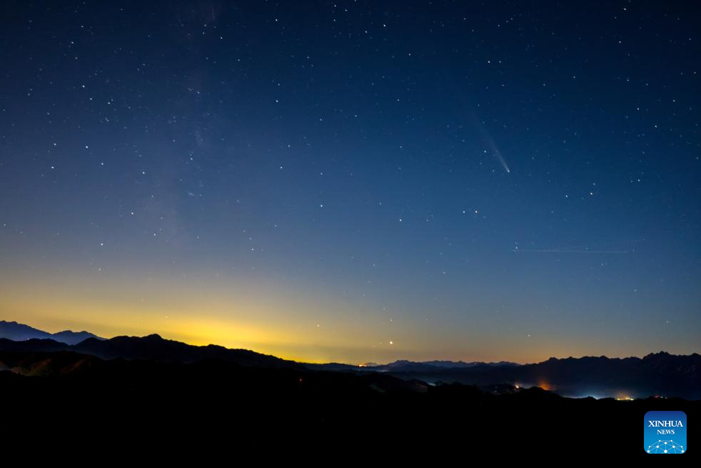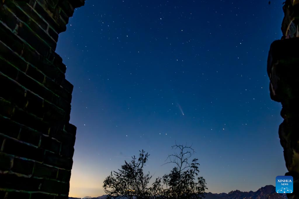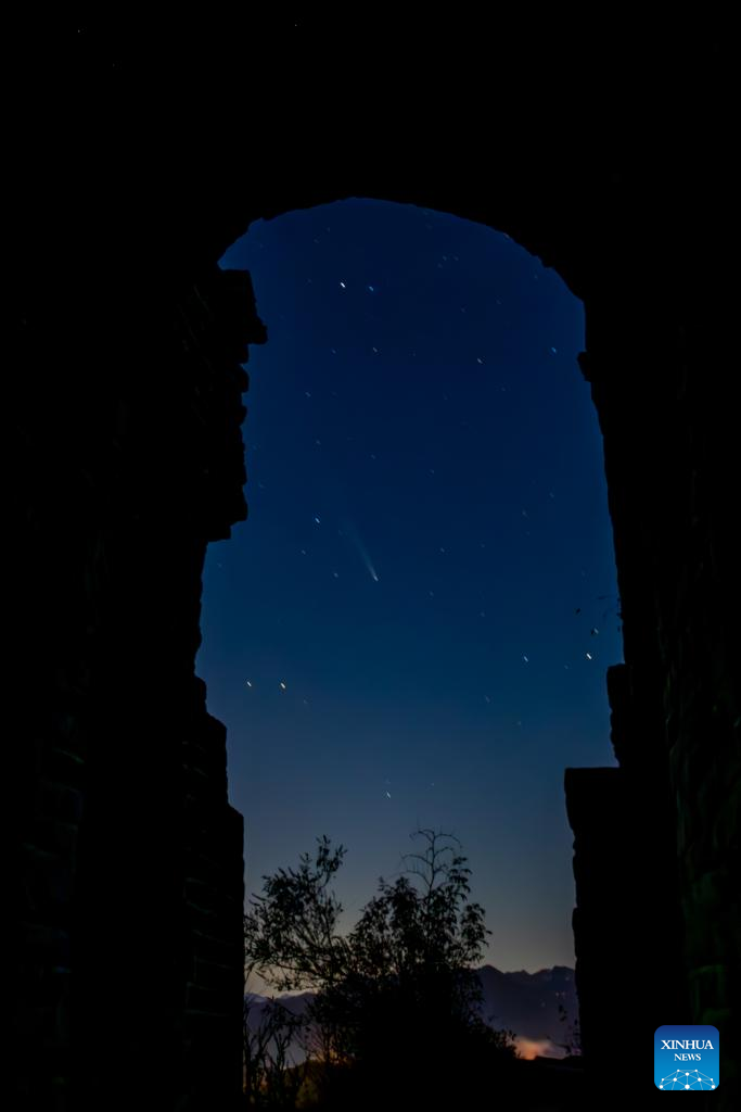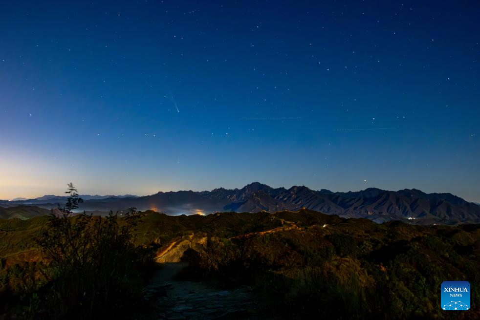 The comet C/2023 A3 (Tsuchinshan-ATLAS) is seen in the sky above the Panlongshan section of the Great Wall in Beijing, capital of China, Oct. 19, 2024.