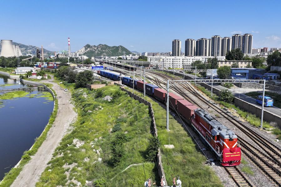 This aerial photo shows a freight train loaded with auto parts, home appliances and textile products pulling out of the Xiahuayuan railway cargo terminal in Zhangjiakou, north China's Hebei Province. (Photo by Wu Diansen/Xinhua)