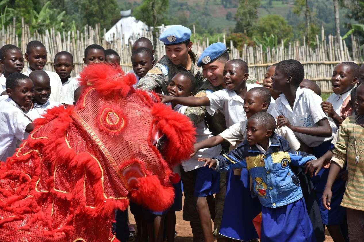 The Chinese peacekeeping engineering company to the United Nations Organization Stabilization Mission in the Democratic Republic of the Congo joins a donation event at a local primary school. (Photo by Zhang Qi)
