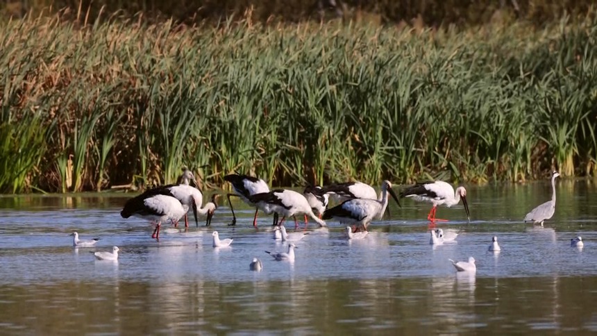 In Sanjiang National Nature Reserve located in Fuyuan city, northeast China’s Heilongjiang Province, flocks of oriental white storks lounge by the lake, spreading their wings lightly from time to time. In the distance, egrets, either hovering in the air or foraging for food in the wetlands, gather as a group to prepare for the southward migration.