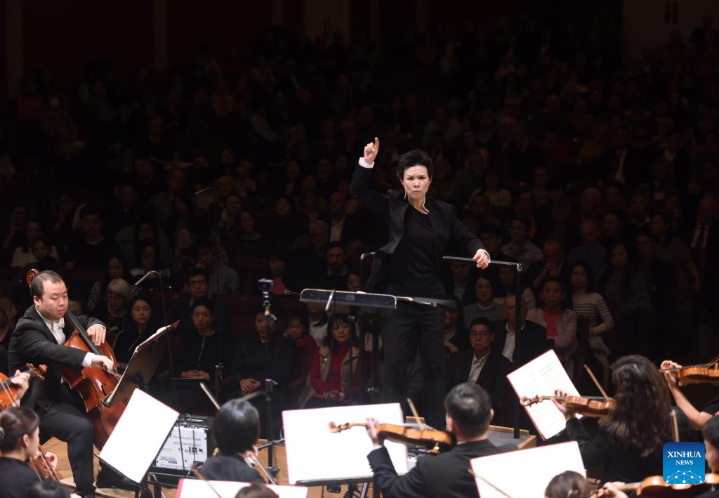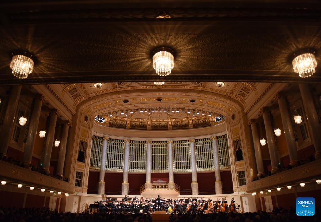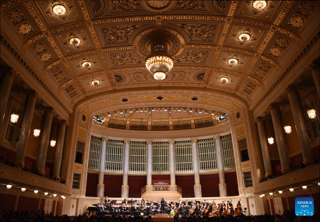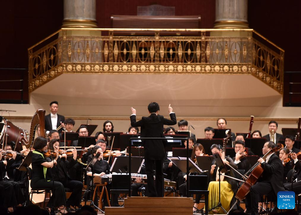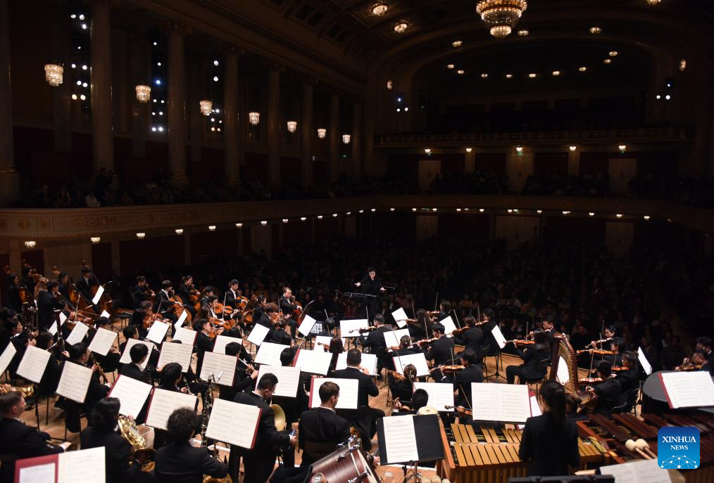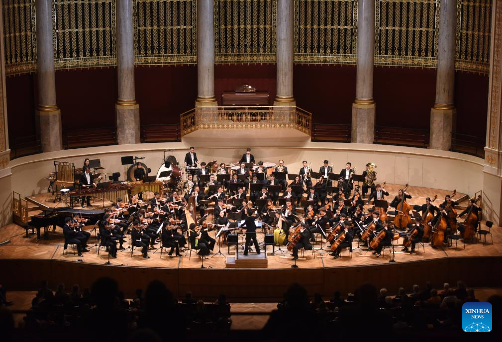 This photo taken on Oct. 20, 2024 shows a symphony concert given by the symphony orchestra of China's Central Conservatory of Music in Vienna, Austria. (Xinhua/He Canling)