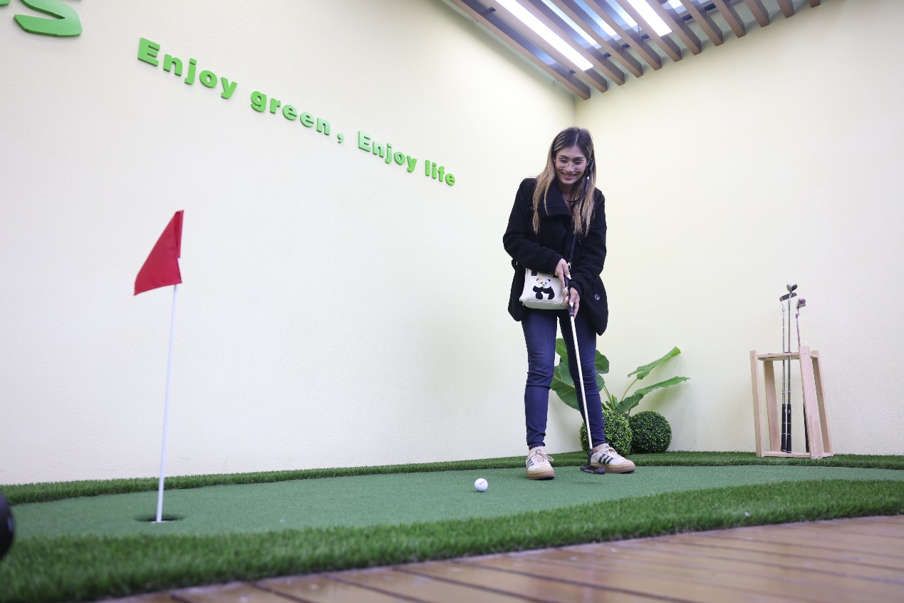 A journalist plays golf at an indoor experience zone of CoCreation Grass Co., Ltd. (CCGrass) in Huai'an, east China's Jiangsu Province, on Oct. 20, 2024. (People's Daily Online/Li Yuchen)