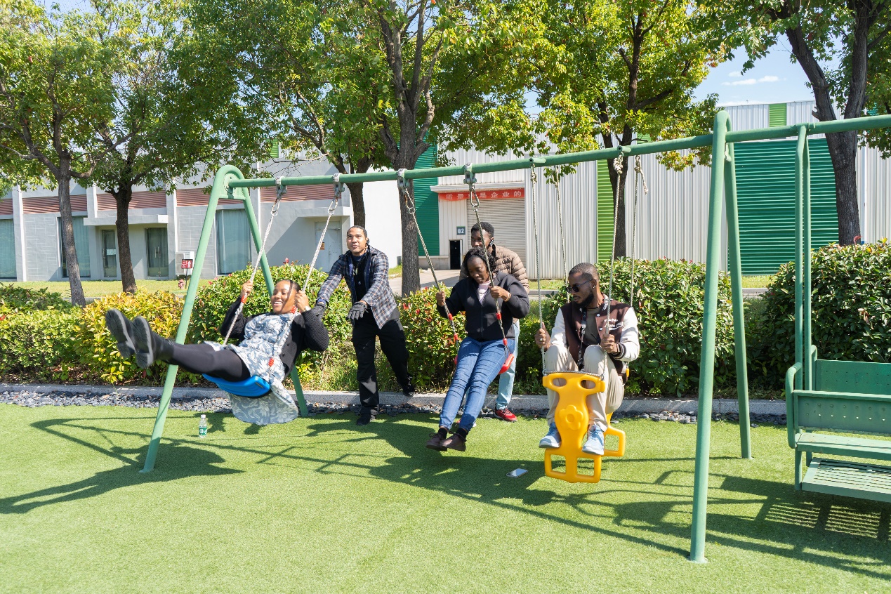 Journalists play on swings at an experience zone of CoCreation Grass Co., Ltd. (CCGrass) in Huai'an, east China's Jiangsu Province, on Oct. 20, 2024. (People's Daily Online/Chang Sha)