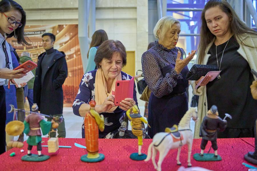 A visitor (C) takes photos of dough modelling art works during the Jilin Culture and Tourism Week in Vladivostok, Russia, Oct. 25, 2023. (Photo by Guo Feizhou/Xinhua)