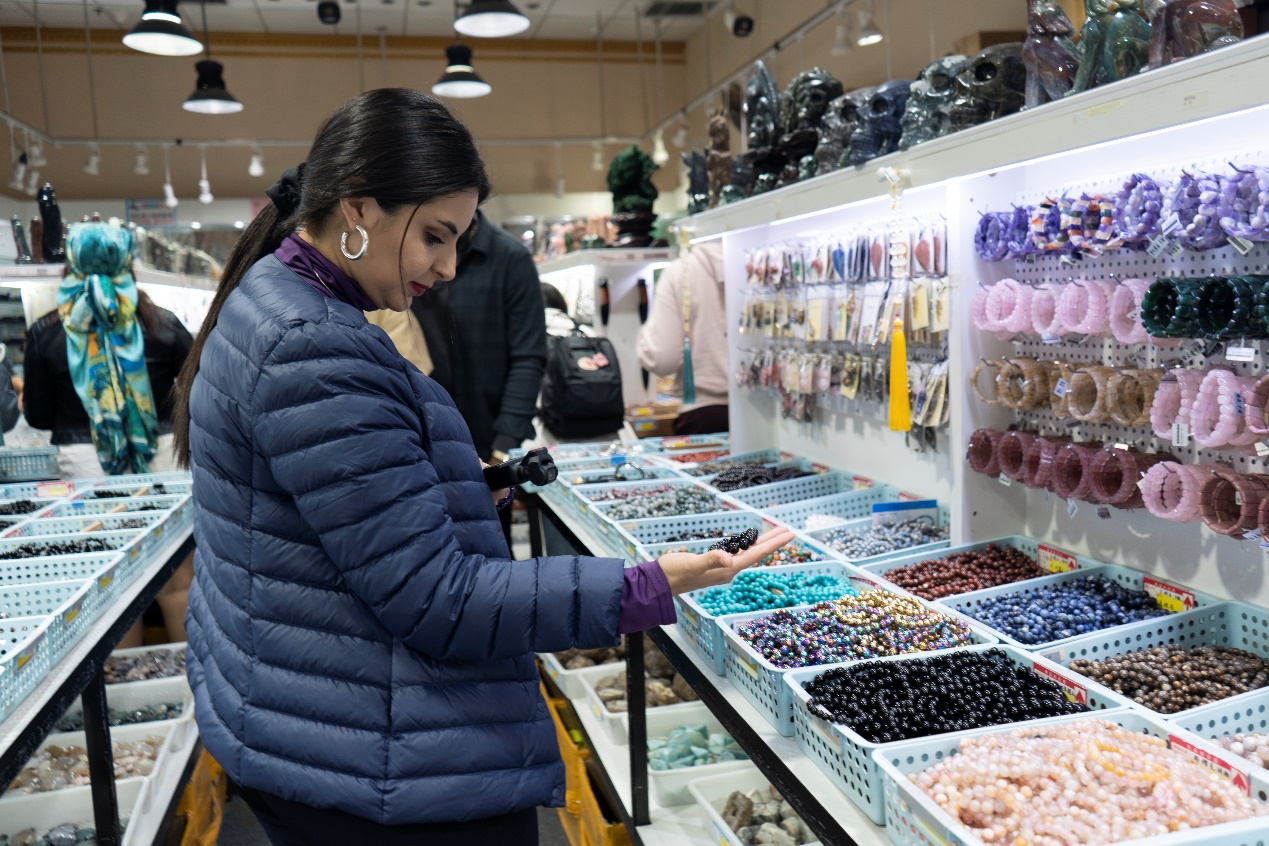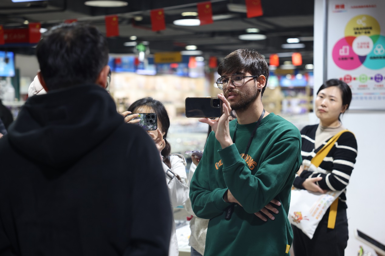 Guilherme Oblasser Paladino, a journalist at Brazil's Brasil247, was impressed to see that many raw crystals here are sourced from Latin America, especially his home Brazil, and expressed his appreciation for how these rough materials are processed into fine handicrafts.
