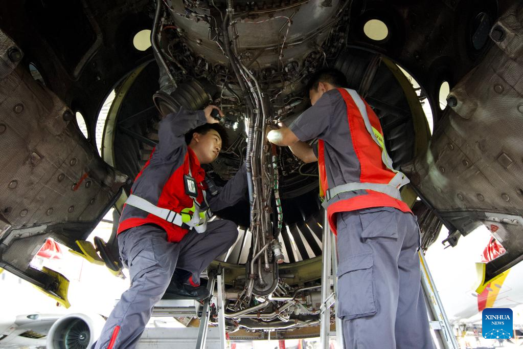Workers of HNA Technic maintain an inbound airplane at the one-stop aircraft maintenance base of Hainan Free Trade Port in Haikou, south China's Hainan Province, Oct. 21, 2024. Inbound airplanes in Hainan are eligible for preferential treatments of the free trade port including exemption of cash deposite as well as duty-free fuel and maintenance supplies. The comprehensive bonded zone of Haikou Airport reaped more than 20 billion yuan (about 2.81 billion U.S. dollars) worth of bonded maintenance services for these airplanes in the first three quarters of 2024. (Xinhua/Zhang Liyun)